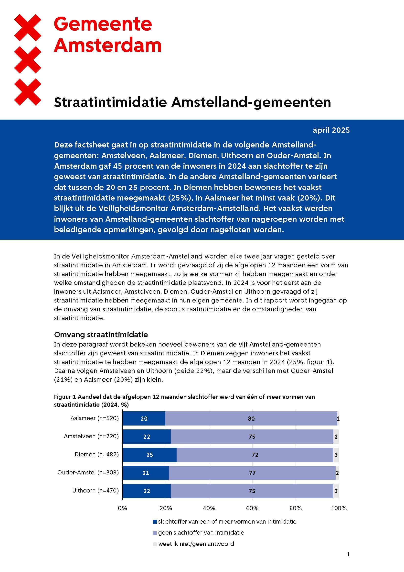 Deze factsheet gaat in op straatintimidatie in de volgende Amstelland-gemeenten: Amstelveen, Aalsmeer, Diemen, Uithoorn en Ouder-Amstel. Het aandeel inwoners dat in 2024 aangaf slachtoffer te zijn geweest van straatintimidatie varieert tussen de 20 en 25 procent.