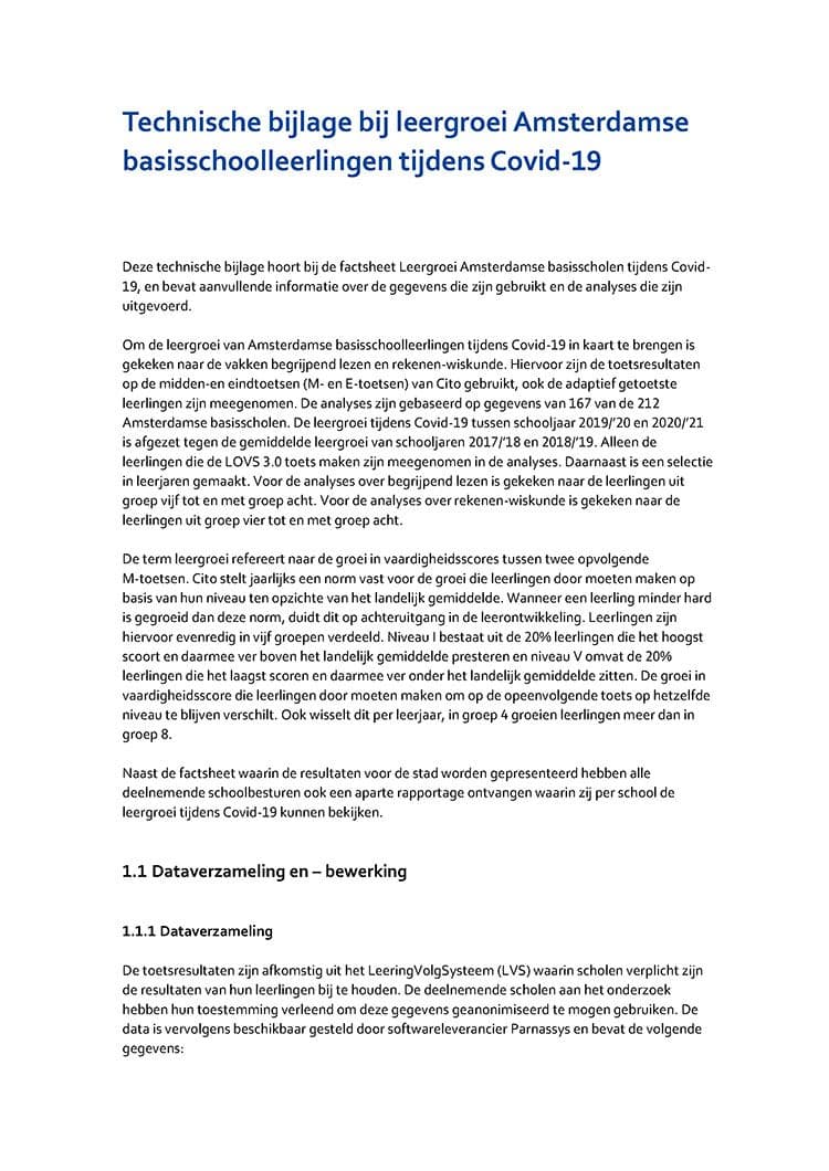 Deze technische bijlage hoort bij de factsheet Leergroei Amsterdamse basisscholen tijdens Covid-19, en bevat aanvullende informatie over de gegevens die zijn gebruikt en de analyses die zijn uitgevoerd.