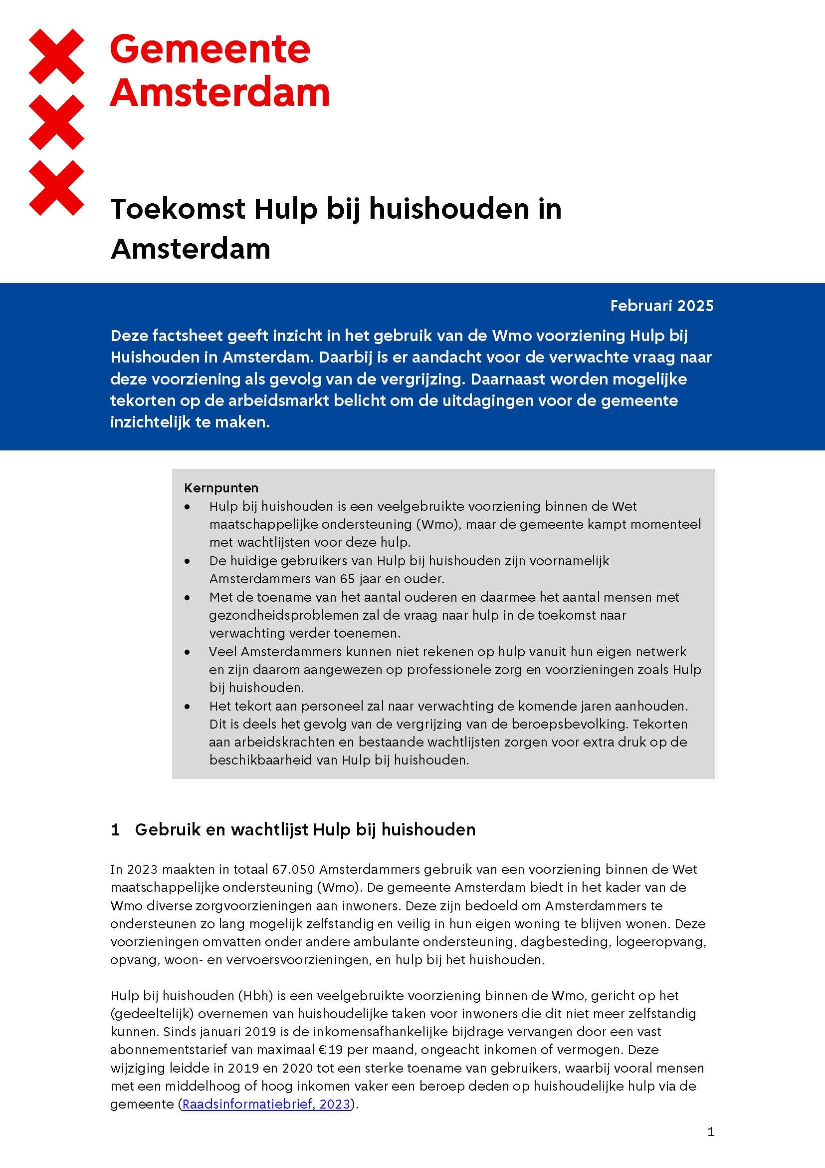 Hulp bij huishouden is een veelgebruikte voorziening binnen de Wet maatschappelijke ondersteuning (Wmo). Momenteel kampt de gemeente met wachtlijsten voor deze hulp. In deze factsheet gaan we in op de groeiende behoefte aan Hulp bij huishouden, die vooral wordt veroorzaakt door de groei in het aandeel Amsterdammers van 65 jaar en ouder. Ook besteden we aandacht aan de factoren die bijdragen aan de wachtlijstproblematiek, zoals de vergrijzing en de tekorten op de arbeidsmarkt.