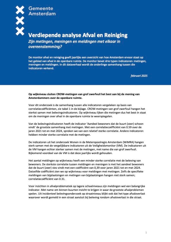 De monitor afval en reiniging geeft jaarlijks een overzicht van hoe Amsterdam ervoor staat op het gebied van afval in de openbare ruimte. De monitor bevat drie typen indicatoren: metingen, meningen en meldingen. In deze verdiepende analyse verkennen we de onderlinge samenhang tussen die indicatoren op basis van correlatiecoëfficiënten.