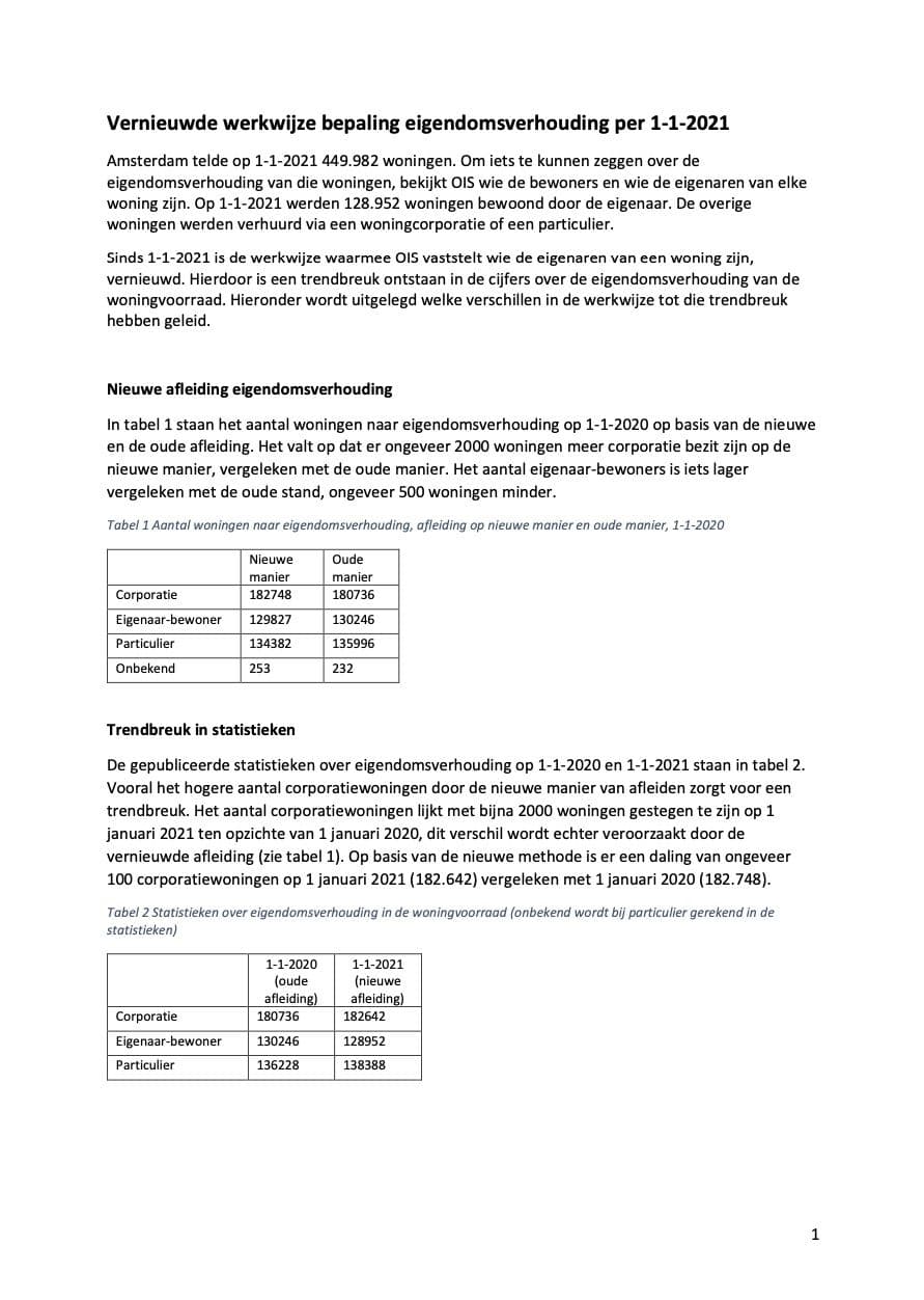 Sinds 1-1-2021 is de werkwijze waarmee OIS vaststelt wie de eigenaren van een woning zijn, vernieuwd. Hierdoor is een trendbreuk ontstaan in de cijfers over de eigendomsverhouding van de woningvoorraad. In dit stuk wordt uitgelegd welke verschillen in de werkwijze tot die trendbreuk hebben geleid.