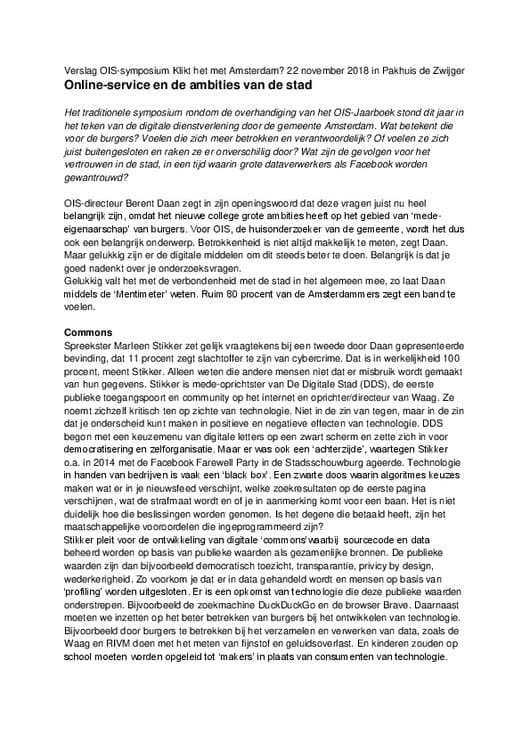 Het traditionele symposium rondom de overhandiging van het OIS-Jaarboek stond in 2018 in het teken van de digitale dienstverlening door de gemeente Amsterdam. Wat betekent die voor de burgers? Voelen die zich meer betrokken en verantwoordelijk? Of voelen ze zich juist buitengesloten en raken ze er onverschillig door? Wat zijn de gevolgen voor het vertrouwen in de stad, in een tijd waarin grote dataverwerkers als Facebook worden gewantrouwd?
