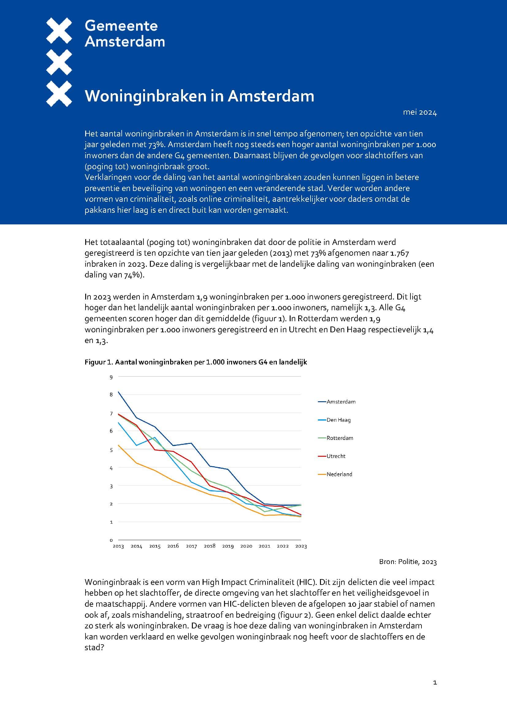 Het aantal woninginbraken in Amsterdam is in snel tempo gedaald. In tien jaar tijd namen de inbraken met 73 procent af. Er zijn verschillende mogelijke verklaringen voor die afname. Zo nemen mogelijkheden tot preventiemaatregelen toe en beveiligen bewoners hun woning waarschijnlijk beter. Ook neemt het sociaal toezicht toe. Tenslotte zijn andere vormen van criminaliteit mogelijk aantrekkelijker geworden voor daders omdat die een grotere en makkelijkere opbrengst opleveren.